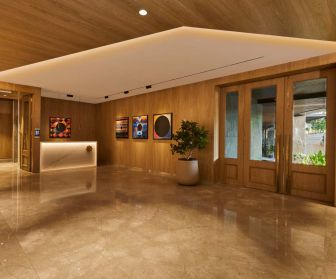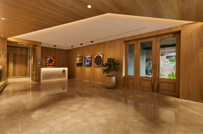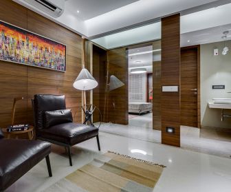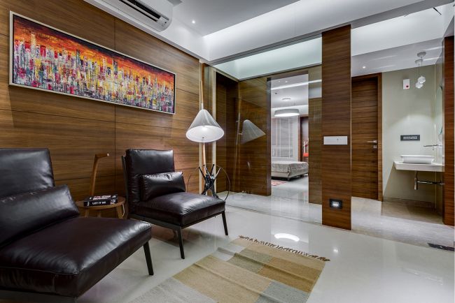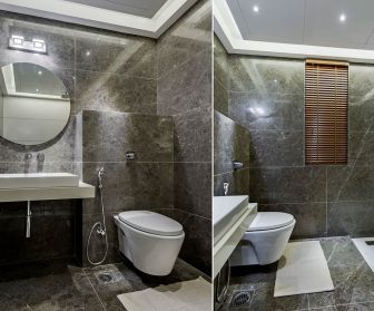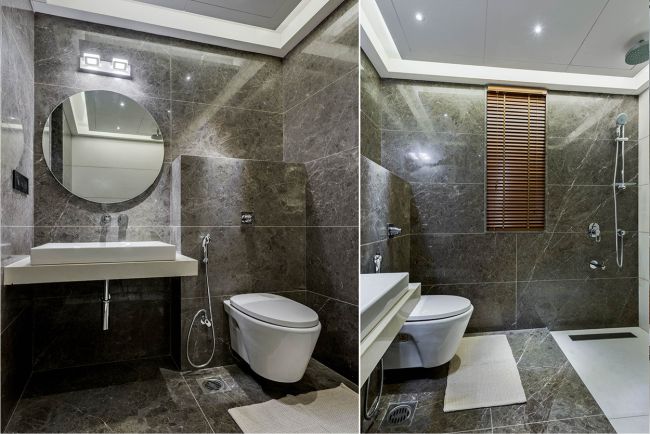Waterproof flush doors at the entrance with teakwood wood panelling and black granite door frames for toilets