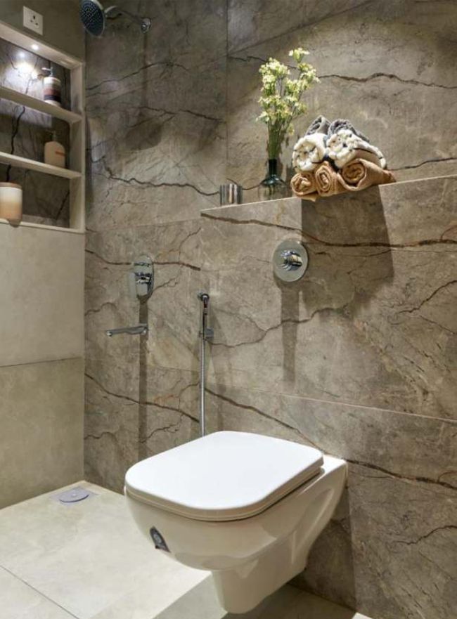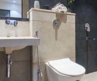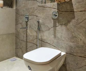 Branded makes CP fittings with hot & cold mixer shower, English commode of ISI mark and concealed flush tanks or flush valves