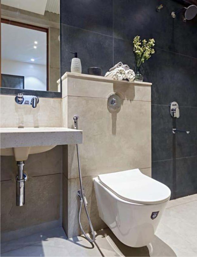 Waterproof flush doors at the entrance with teakwood wood panelling and black granite door frames for toilets